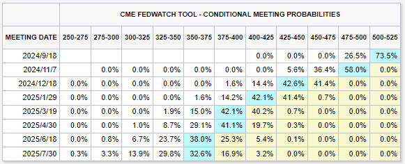 以芝商所 FedWatch 数据来看,投资者预期九月降息一码的机率为 73%,并没有像八月初时对降息两码机率高达 69% 的恐慌情绪,这也显示,如果联准会是以缓步降息的方式,在通膨放缓的情况下,慢慢将基准利率下调,使金融借贷市场能重新回到正轨,应有助于经济的成长,顺利摆脱殖利率曲线倒挂的衰退阴影。