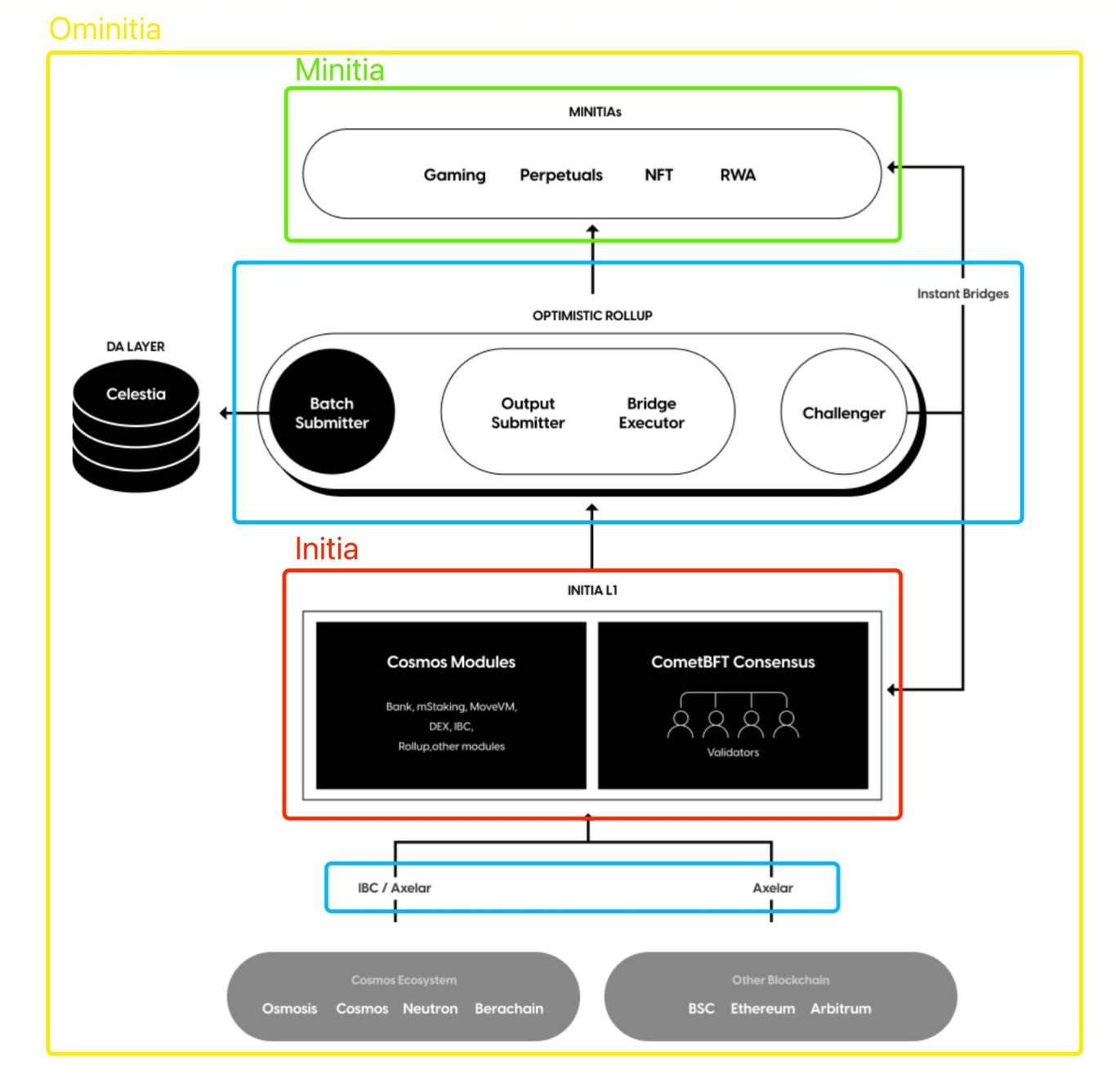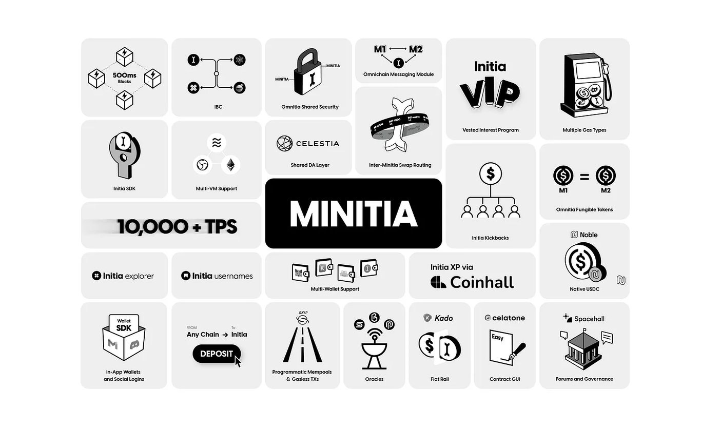 Ominitia: 包含了 Initia (Layer1),Minitia(Layer2s),OPInit Stack,Bridging Middleware 等在内的所有核心组建的平台,称为 Ominitia.