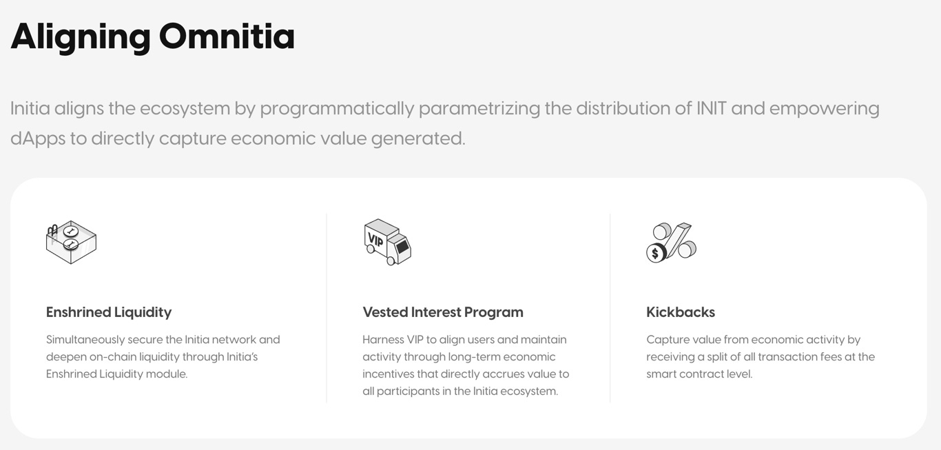 根据官方的说法:拥有完整的技术堆栈将使 Initia 能够实施链级机制,以协调用户、开发者、第 2 层应用链和第 1 层链本身的经济利益。