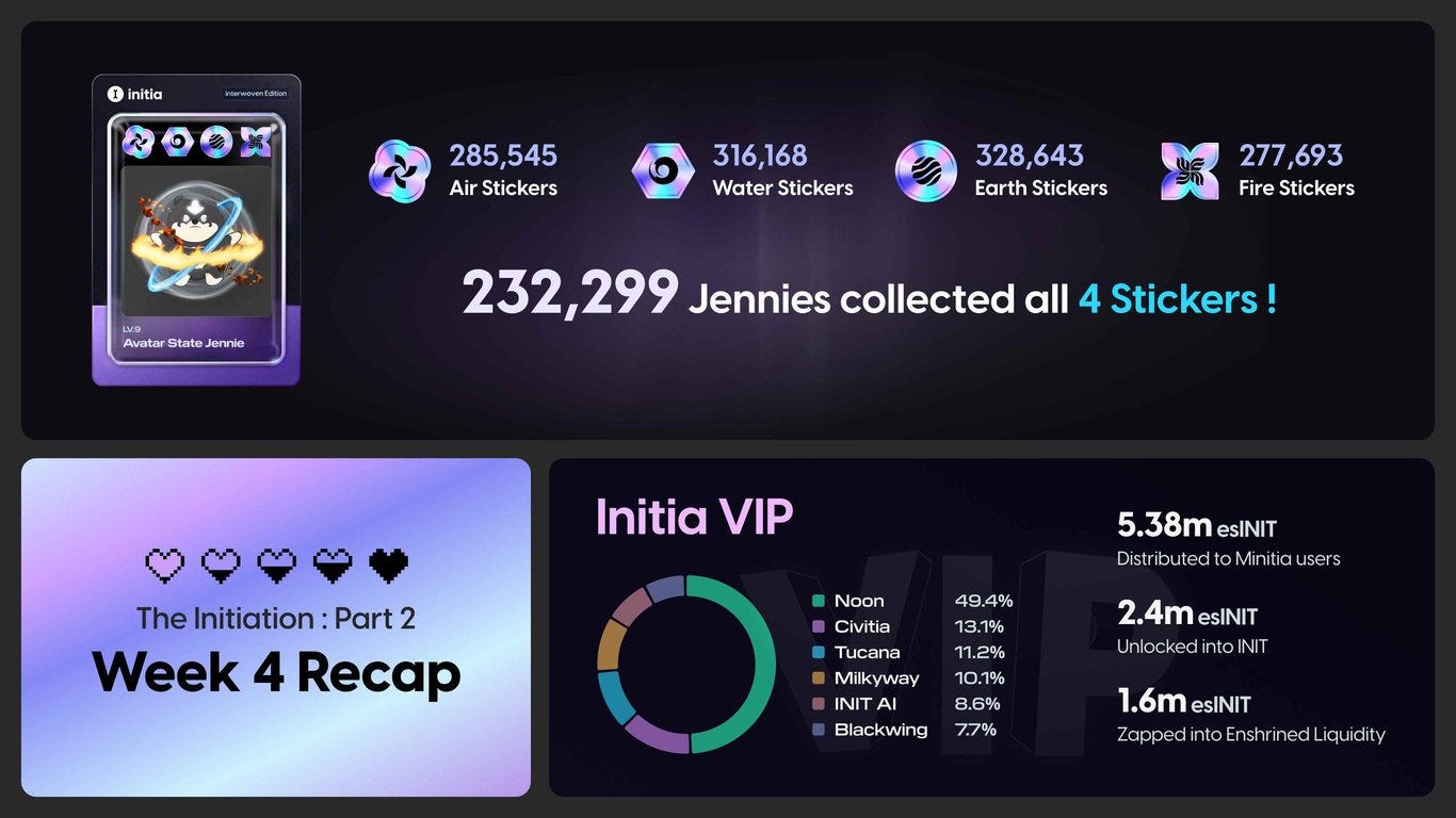 前不久,Initia 刚完成一个为期 12 周的测试网活动,用户需要完整完成多个活动,并保持活跃才能拿到最终的 Jennie NFT 奖励(Jennie 是 Initia 团队的宠物,各类meme的主要来源)。同时,用户如果深度参与到 VIP 计划,交互 MinitSwap,Minitias 等,还能得到一些特定的 Stickers。