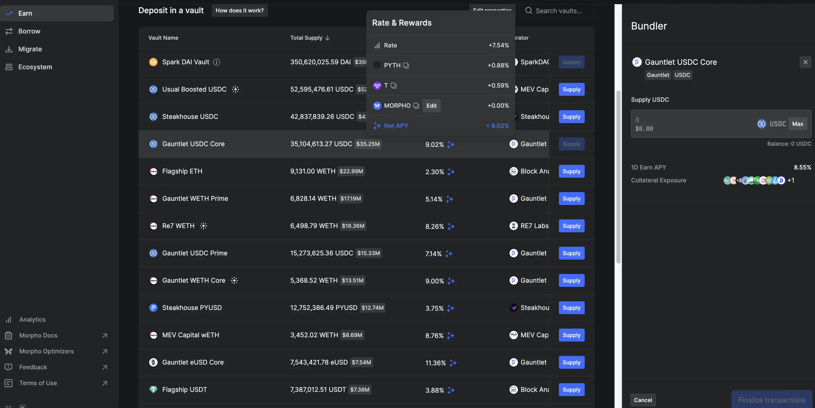 对于存款使用者来说,在 Eran 页面通过搜寻功能可以直接筛选出你需要的资产,存入资产后,不仅可以赚取借款人支付的基础收益,还可以获得 MORPHO 代币和由第三方提供的其他奖励。利息在从金库提现时发放,奖励则每月在奖励页面发放并可领取。