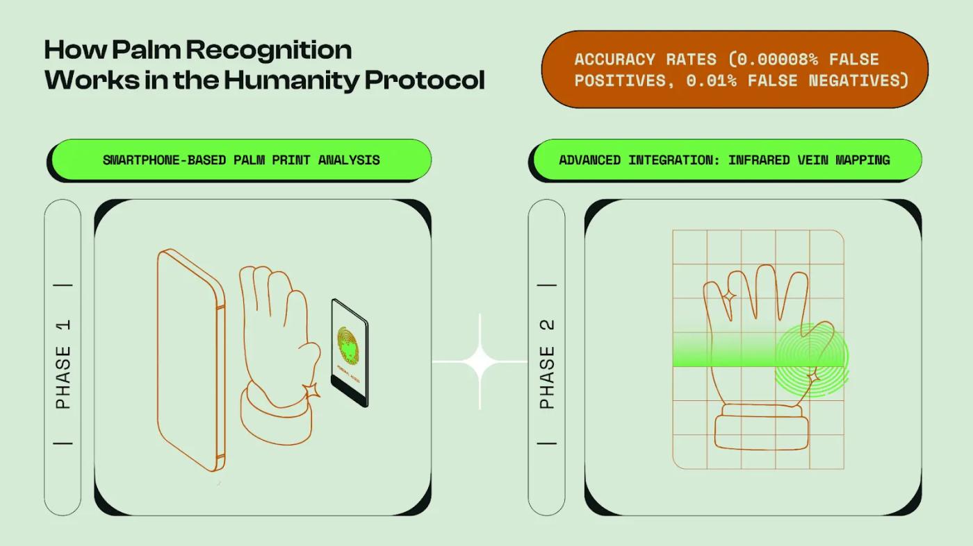 Humanity Protocol的掌纹识别相对不那么敏感,且可通过普通智能手机实现