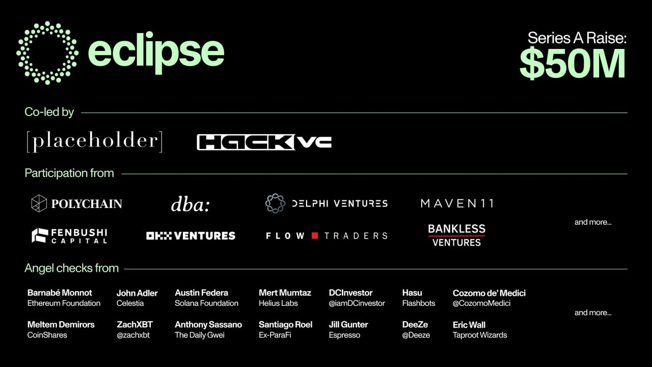 Eclipse Labs 宣布完成一轮 5000 万美元的融资。这轮融资的投资者包括 Placeholder、Hack VC、Delphi Digital、Maven11、Polychain、Fenbushi Capital、Bankless Ventures、OKX Ventures、Flow Traders 和 DBA 等知名机构,以及个人投资者如 John Adler、Austin Federa 和 DCInvestor 等。