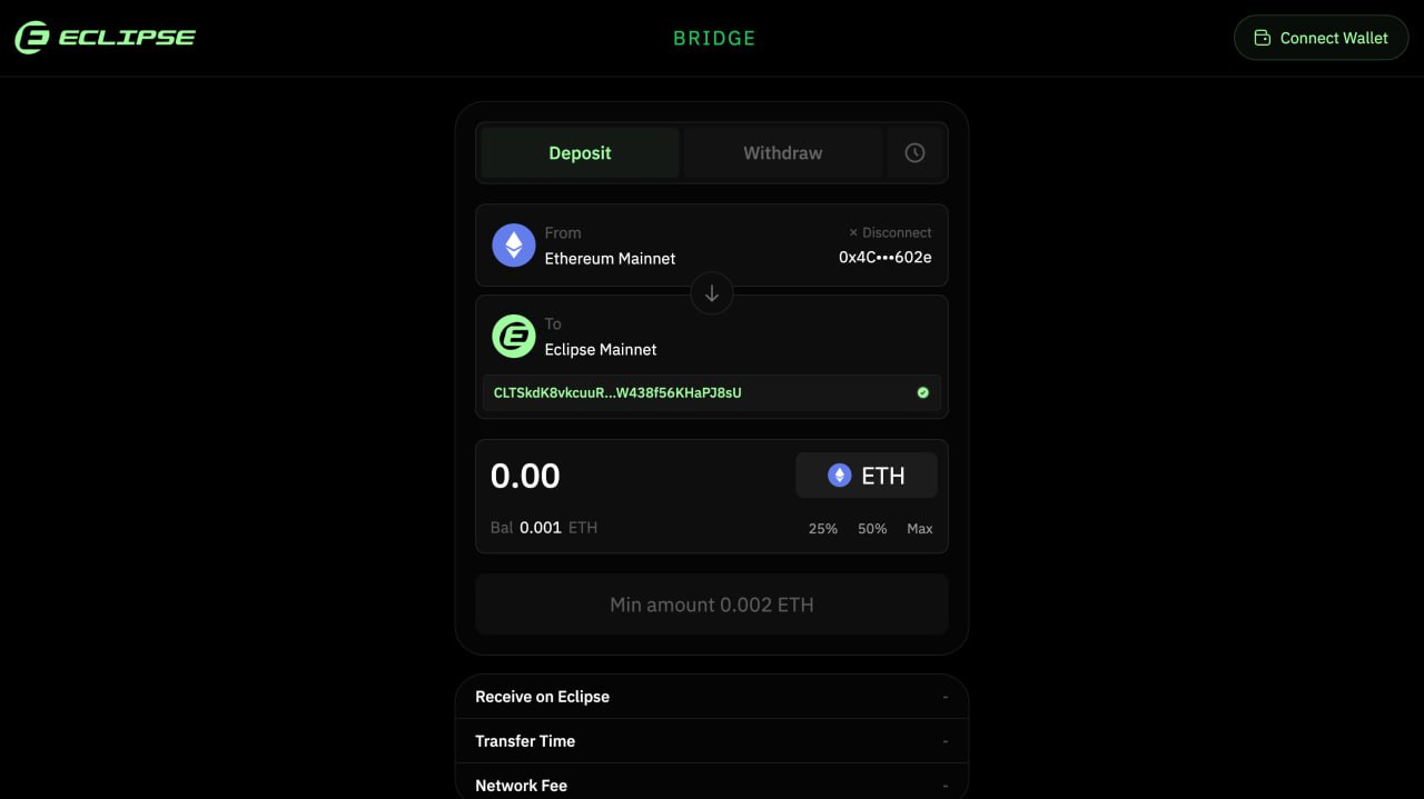 2. 通过官方跨链桥从以太坊主网ETH去Eclipse主网(可以在Gas低的时候操作,跨链需等待几分钟):https://bridge.eclipse.xyz/