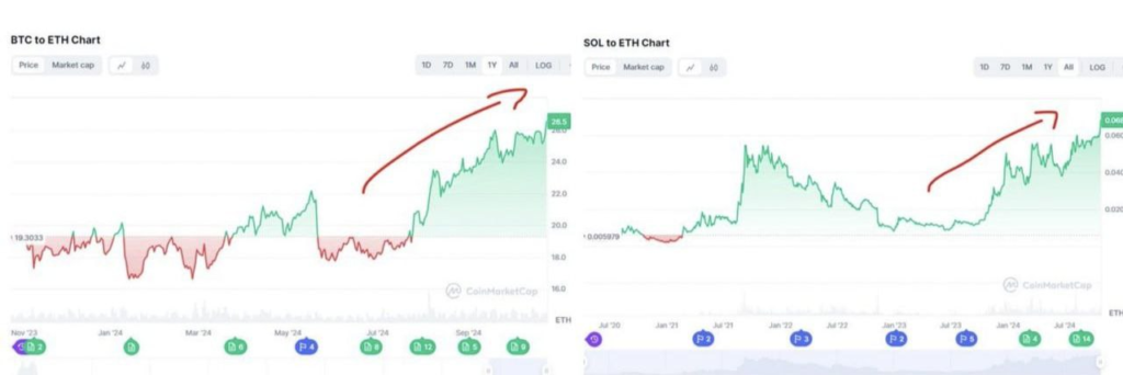 过去两年,以太坊的重大升级让人们对其未来充满期待,尤其是 ETH 供应的「通缩」效应。然而,市场的实际表现却让人意外。尽管进行了一系列扩容和升级,ETH 的市场表现相对逊色,甚至被 BTC 和其他代币(如 Solana)显著超越。
