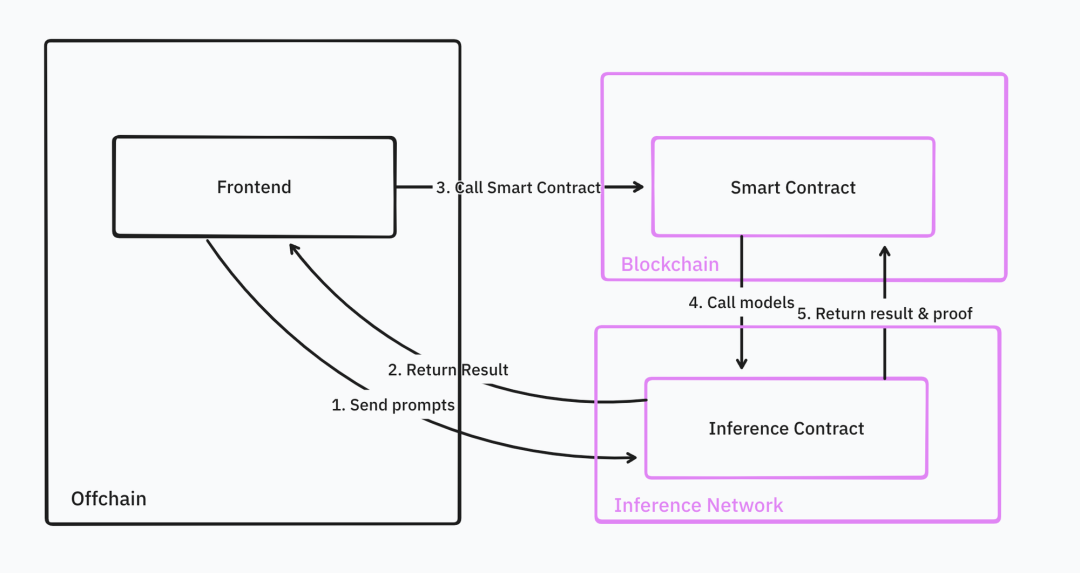 理想的情况是,开发者可以在任何地方,通过任何形式的证明,轻松地访问自定义的 AI 推理服务,整合过程中几乎没有任何阻碍。推理网络提供了开发者所需的全部基础支持,包括按需生成和验证证明、进行推理计算、推理数据的中继和验证、提供 Web2 和 Web3 的接口、一键式模型部署、系统监测、跨链操作、同步集成及定时执行等功能。