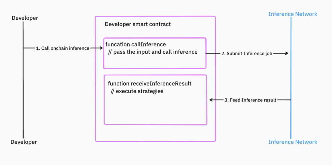 所有模型部署步骤完成后,开发者可以直接通过 Web3 API 或智能合约调用模型推理。推理网络将持续执行这些交易策略,并将结果反馈给基础智能合约。如果开发者管理的社区资金量很大,还需要提供推理结果的验证。一旦收到推理结果,智能合约就会根据这些结果进行交易。
