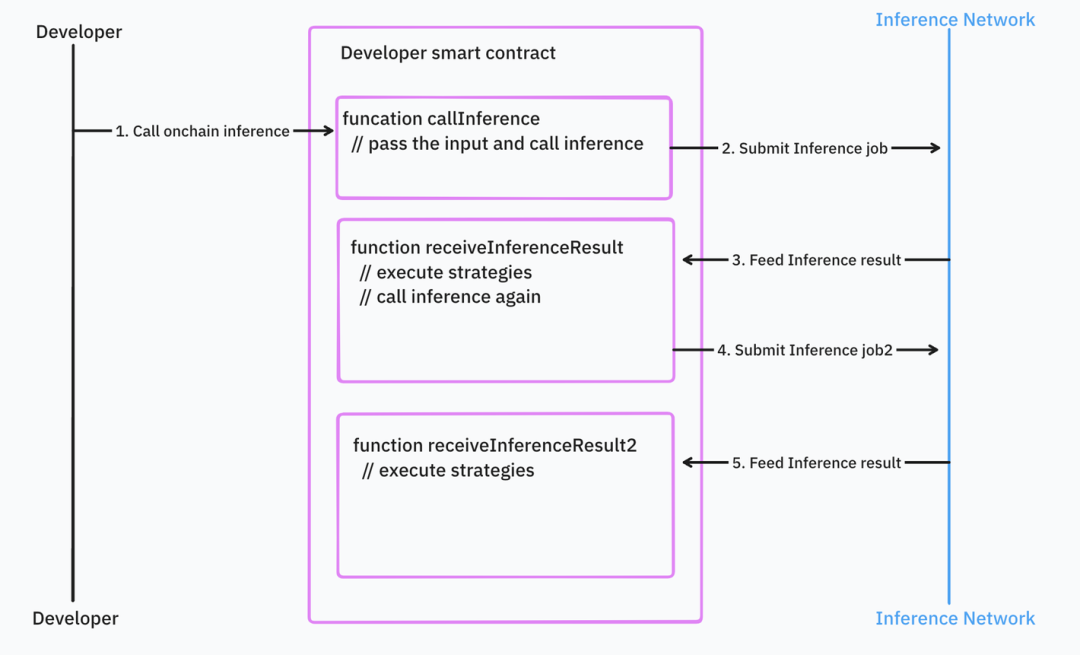 从理论上讲,异步执行的推理操作可以带来更好的性能表现;然而,这种方式在开发体验上可能让人感到不便。在采用异步方式时,开发者需要先将任务提交到推理网络的智在合约中。当推理任务完成后,推理网络的智能合约会将结果返回。在这种编程模式下,逻辑被分为推理调用和推理结果处理两个部分。