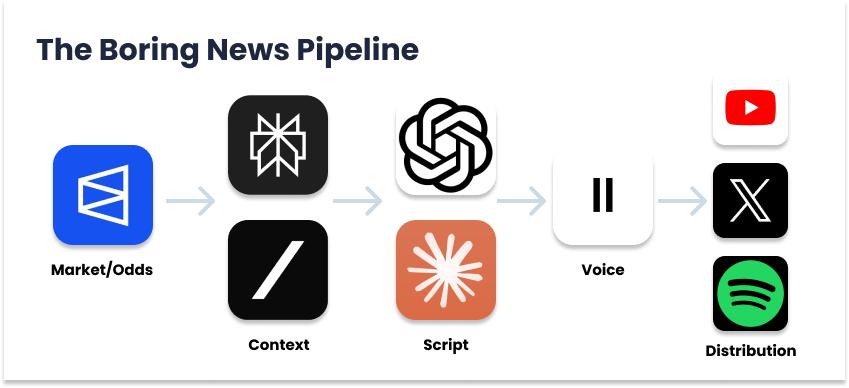 预测市场流动性太差,无法准确。人工智慧不够强大,也没有足够的网路连线来提供相关的上下文,将其转化为脚本,或透过真实的语音复制以音讯格式传送脚本。这些工具只会变得更好,我们希望 Boring News 能够像它们(以及我们一样)继续变得更好。