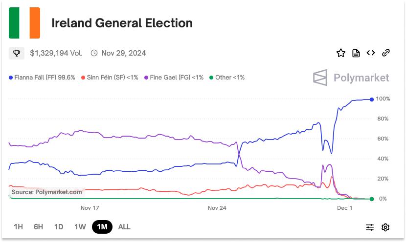 Polymarket 上的真实情况已经很清楚了,新芬党的赔率在一个多月里一直低于 20%,投注者早在 11 月 25 日就正确预测了 Fianna Fáil 的胜利。如今,Fianna Fáil 的比率为 99.7%。