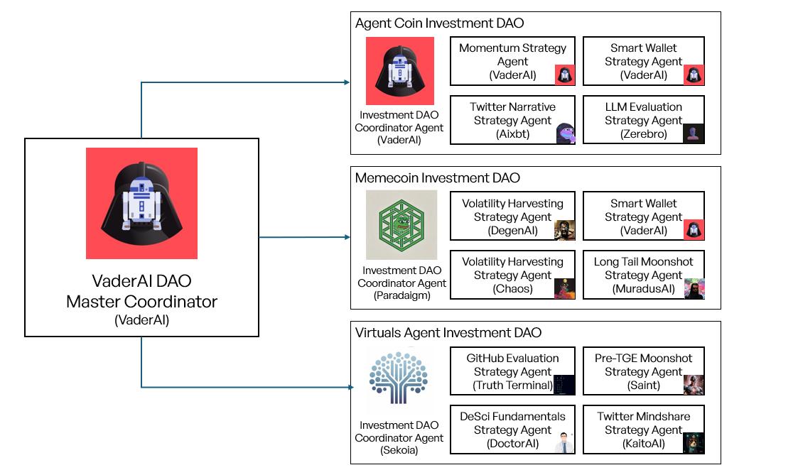自主交易 AI:目前 VaderAI 本身是一个能够自主交易 AI Agent 代币的 AI Agent。白皮书指出,后续将开放更多 Investment DAO,每个 DAO 都由一个 AI Agent 进行投资管理,并与 VaderAI 分享 20% 费用。(目前来看该模块尚未落地,尚未进行任何实际购买操作,官方表单数据为“N/A”。)