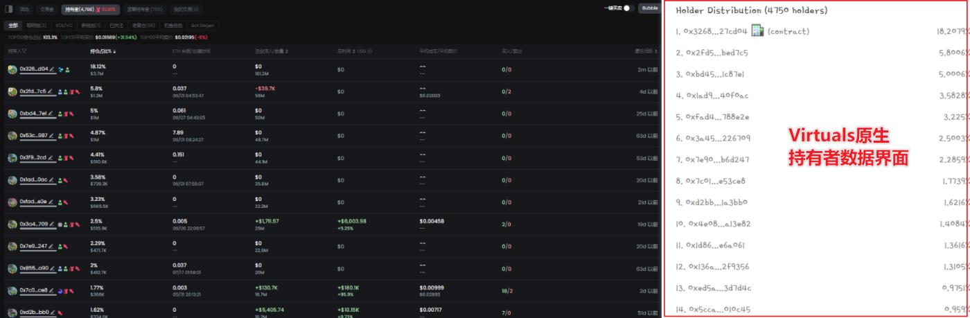 在数据查阅与监控方面,依旧推荐 GMGN,一方面GMGN对于交易者、持有者以及历史数据的展示更为全面,相较于 Virtuals 原生的数据界面更为友好、高效。