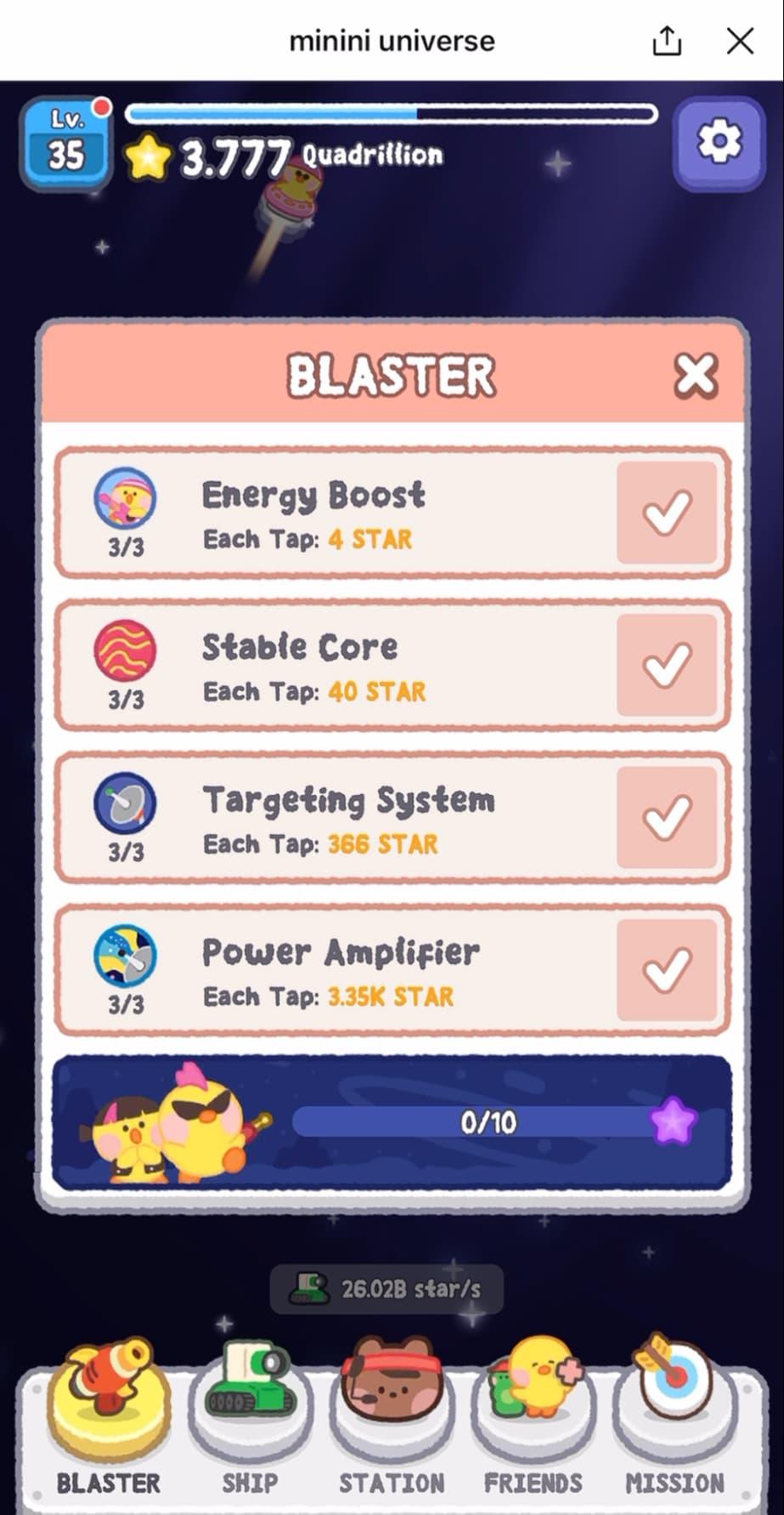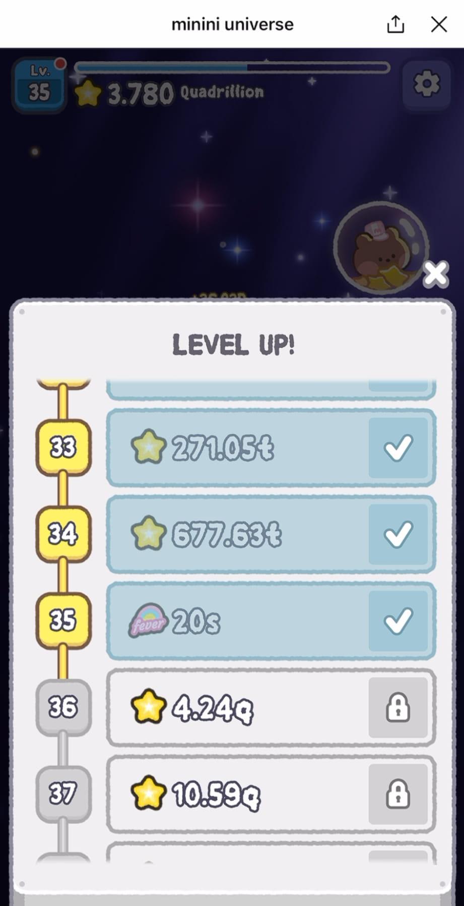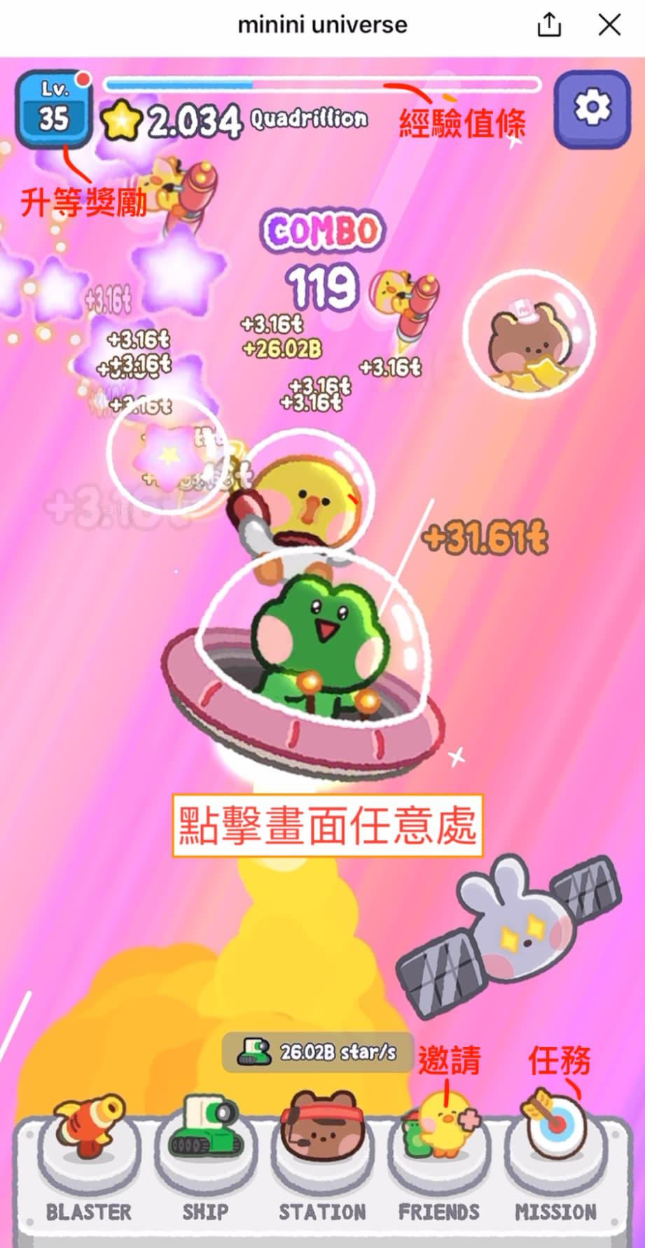 Minini Universe 除了直接点击赚星星,还有下面几个小技巧能让你快速「升等」: