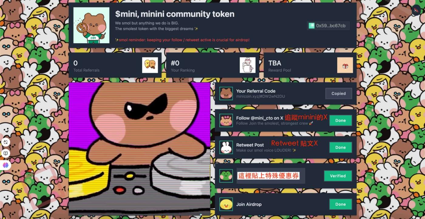 还记得去年在 Telegram 掀起的点击小游戏风潮吗?简布廷(捡不停)为了空投,都快把萤幕点穿了,幸亏还是有捡到一些空投,而这个风潮似乎即将在 LINE 上面再次引爆?由 LINE Friends 旗下 IP ——「Minini」最新推出的 Minini Universe,承袭点击小游戏的基因,并且在官方已经在 X 表示:未来会有空投!简布廷我知道你们懒得一步一步慢慢来,想知道怎么样可以领取最多空投对吧?所以直接帮大家整理了从「开启游戏」到「申请空投资格」一条龙的懒人包了,兄弟们,还在等什么?