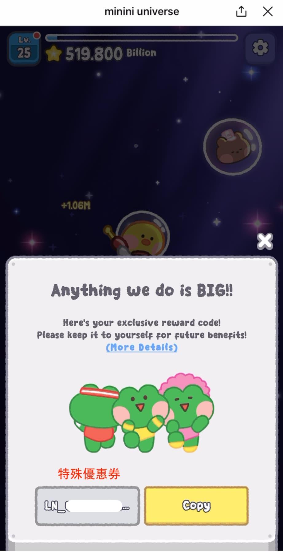 Minini Universe 是由 LINE Friends 旗下 IP ——「Minini」 所推出的一款在 LINE Mini DApp 运行的「点击小游戏」,只要玩到 25 等就可以获得「特殊优惠券」,不仅可以获得 LINE Friends 周边最高 7 折的折扣,还可以登记参与空投活动,知道你忍不住了,游戏连结就放在这里 Minini Universe!