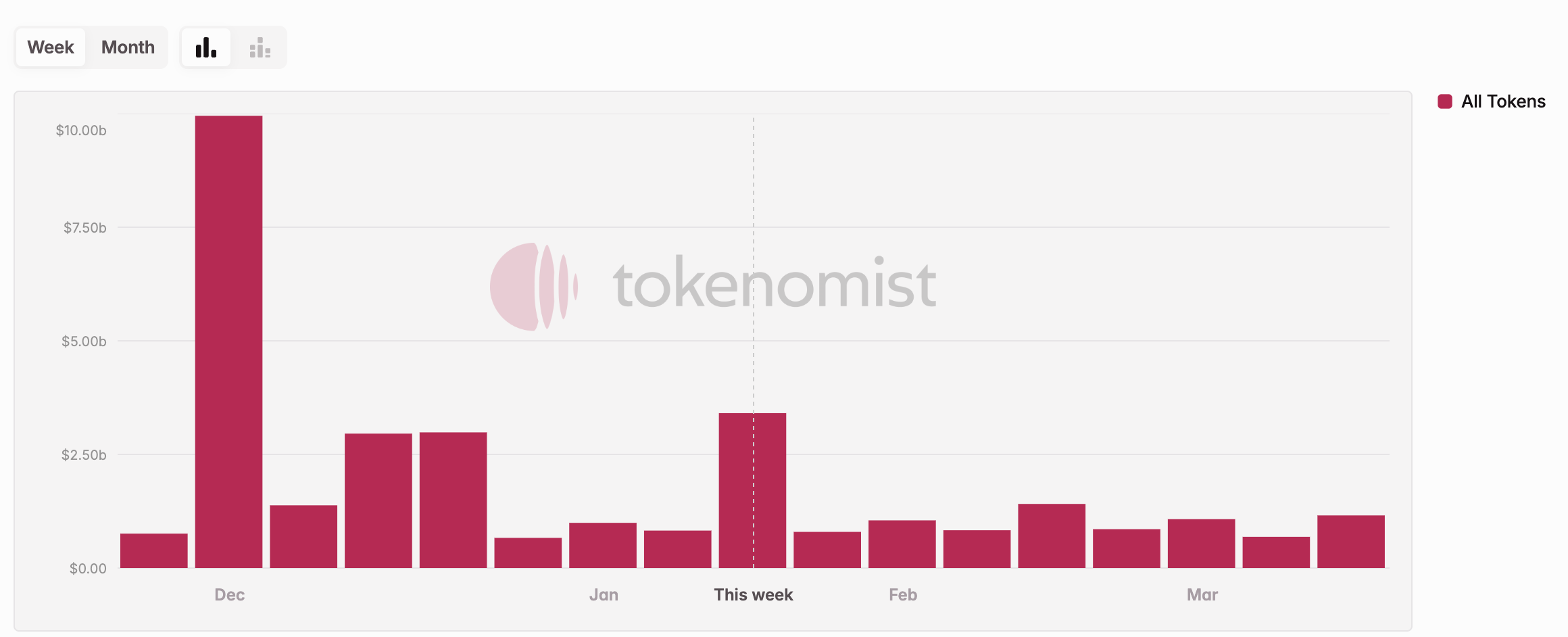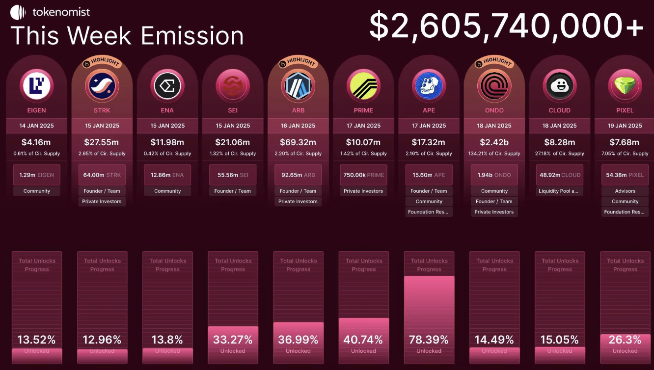据 Tokenomist 数据显示,1/13 至 1/19 当周将有价值总和高达 26 亿美元的加密货币被解锁 ,其中 RWA 题材的龙头老大 ONDO 代币就占据约 24 亿美元的代币价值,格外引人关注。