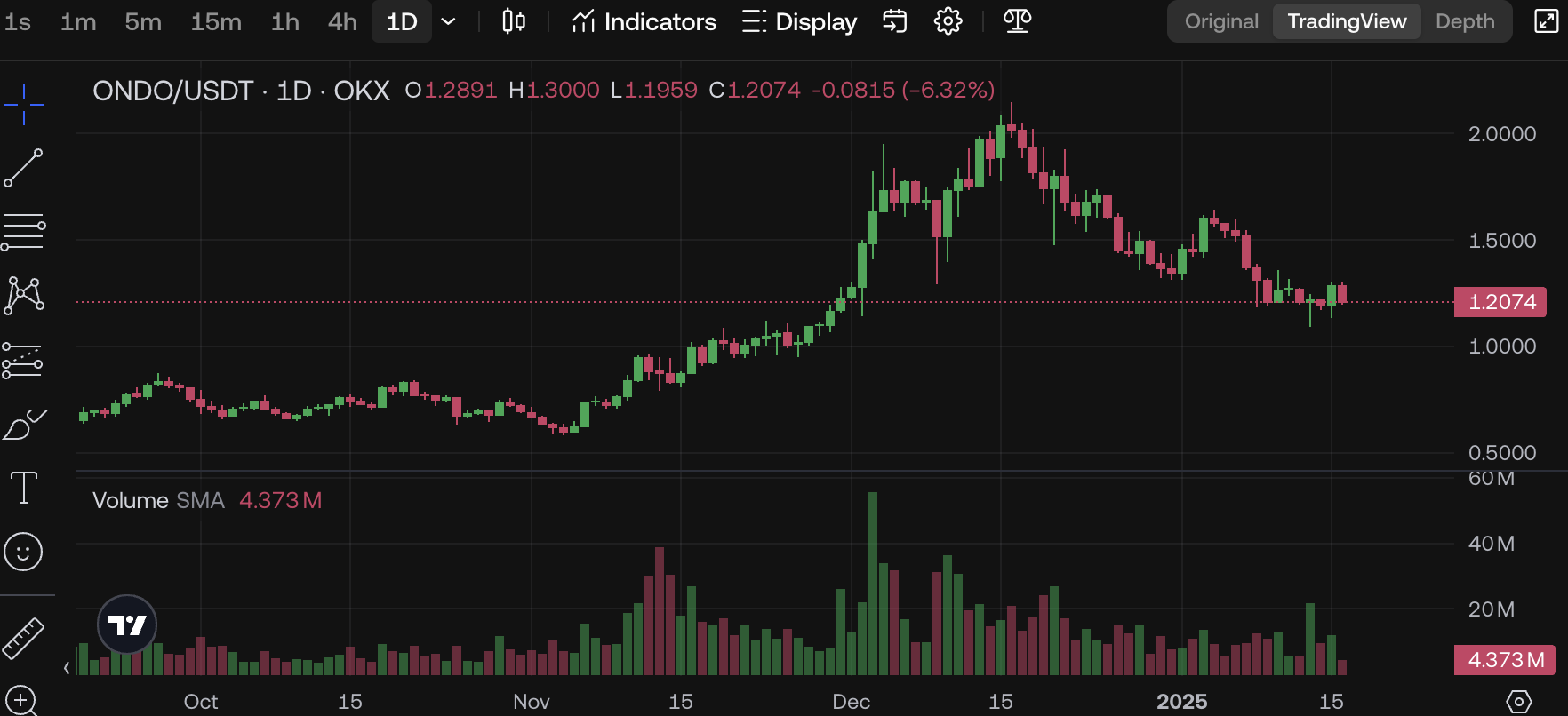 此次 ONDO 解锁的代币数量大幅超过目前流通代币的数量,也超出其日均交易量 25 亿至 30 亿美元,其释放量超过流通供应量及日均交易量,此种的超大规模解锁,可能伴随著强烈的抛压。ONDO 的价格由去年 12 月达到 2 美金后,就开始一路下滑,来到目前的 1.2 美金,30 日以来已经下跌 4 成。
