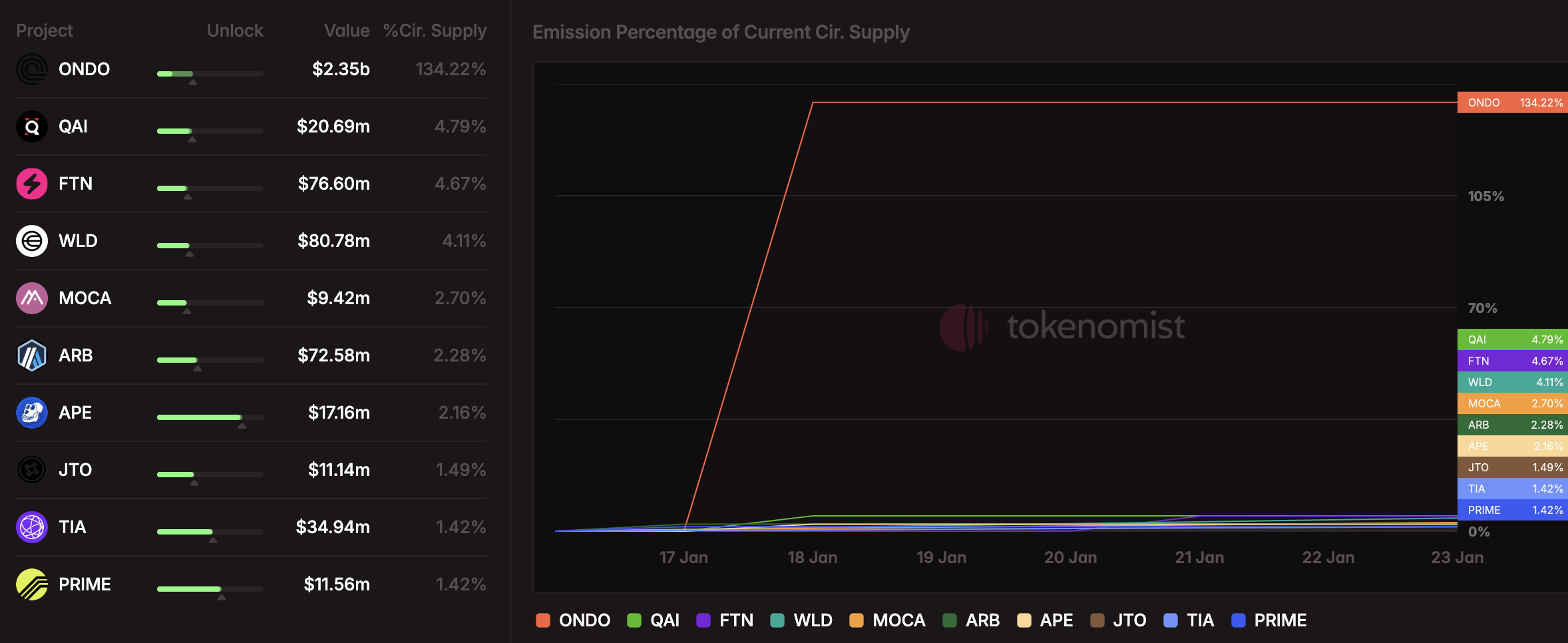 除了 ONDO,本周的解锁计划还包括 ARB、STRK 和 SEI 等多种主要代币。与本周其他解锁代币数量,占总流通的比例来看,ONDO 明显拥有非常夸张的占比。