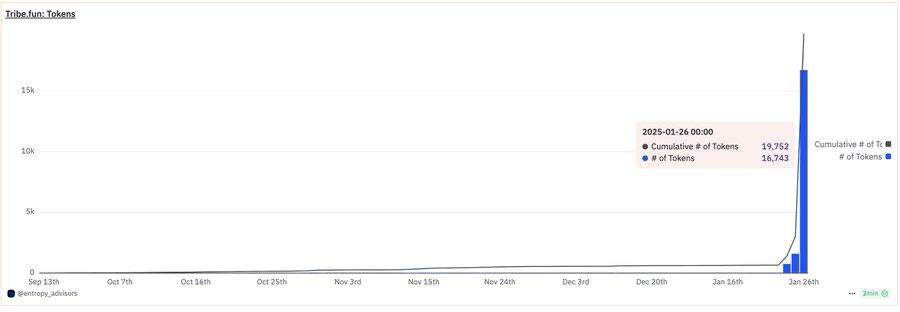同时在数据上你能看到,Tribe.fun 上创建的代币数(一个 KOL 可以创建一个自己的代币)激增,昨天创建的代币数就占到了该平台代币数的 85% 。