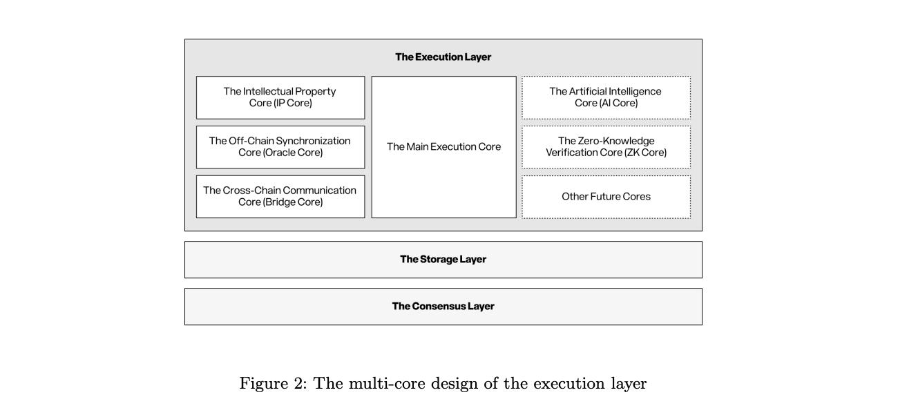 其中,执行层包括主执行核心与专属执行核心:前者主要处理所有交易及智能合约,并激活后者;后者则包括现有的 IP 核心、预言机核心(链下同步核心)与桥接核心(跨链通信核心)以及未来的 AI 核心、ZK 核心及更多专业核心组件。