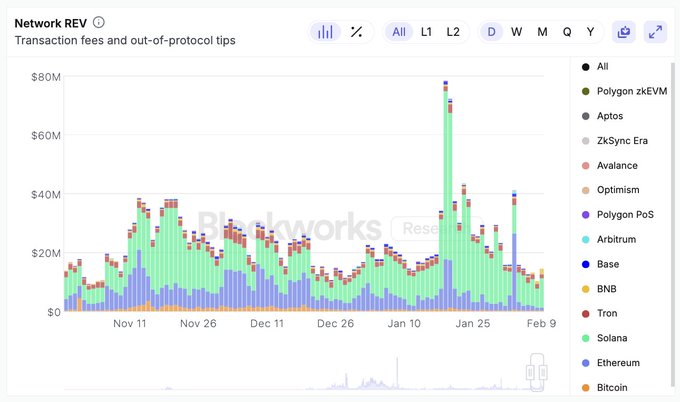 REV = 交易费用+小费,衡量交易需求和价值获取 以下是每周更新 (REV、REV 市场份额,环比变化) Solana:6380 万美元,52%,-44% 以太坊:3520 万美元,增长 29%,+62% TRON:1170 万美元,10%,+5% 基数:220 万美元,2%,-24% BNB环比大幅上涨 104%,至 510 万美元