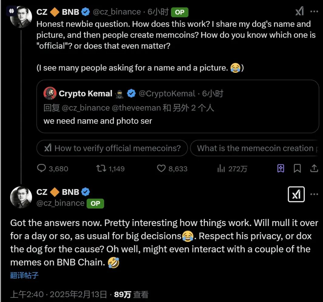 在了解相关机制后,CZ 表示“事情的运作方式很有趣。像往常处理重大决定一样,我需要考虑一天左右。是尊重他的隐私,还是为了大家把狗狗信息公开呢?好吧,我可能还会和 BNB Chain 上的几个 Meme 币互动。”