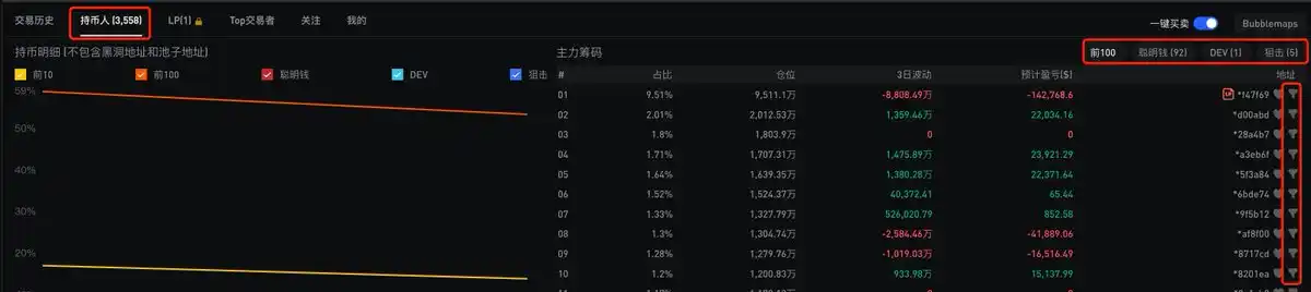 ave 对【持仓人】和【Top 交易者】也有分析。【持仓人】是 Top100 持仓地址的列表,又分为「聪明钱」、「DEV」、「狙击」。