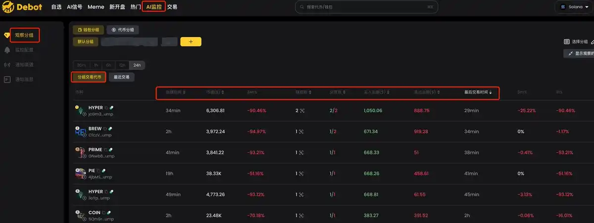 debot 监控汇入聪明钱后,我们在【观察分组】中能按分组检视【分组交易代币】和【最近交易】。【分组交易代币】是列出了此分组中聪明钱在某一个时间段,比如 24 小时内交易过的所有币,可以按不同的指标进行筛选排序。当我们没有盯住聪明钱的即时监控讯息,又想知道这些聪明钱买了哪些币时,这个功能就非常有用。
