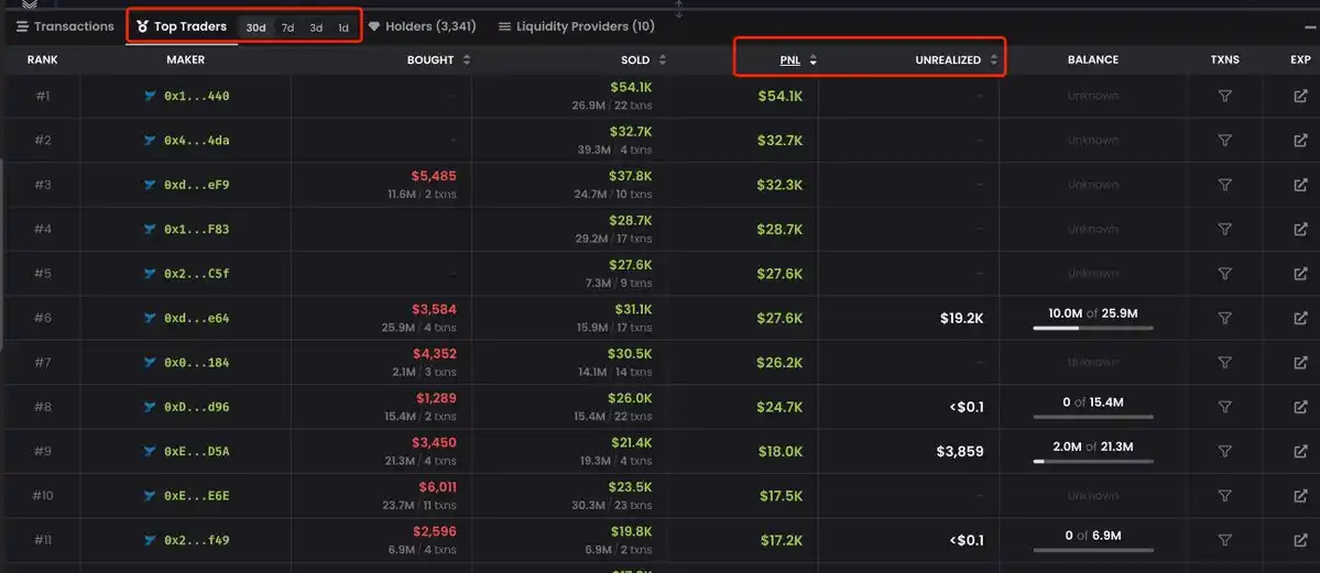 老鹰的【Top Traders】版块列出了最赚钱的前 100 个地址,可以按总利润和未实现利润进行排序,显示资讯有限,不如 debot 和 gmgn 功能好用。