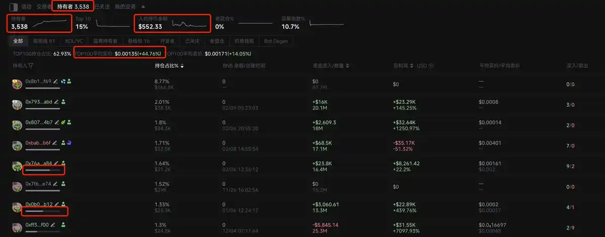在看线的时候,gmgn 的【持有者】版块增加了新功能,可以直观的看到持有者的变化情况、人均持币金额、Top100 平均买价,用来快速的衡量持有者的基本情况非常方便。每个持有人的地址下面会有一个进度条,用来显示当前地址剩余持仓,非常直观,很实用的功能。