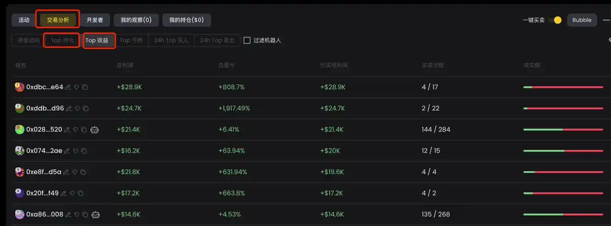在 debot 中输入想分析币的 CA,开启最下面的【交易分析】,我们重点关注【Top 持仓】和【Top 收益】两部分。其中【Top 持仓】是 Top100 持仓的地址列表,【Top 收益】是 Top100 最赚钱地址的列表。