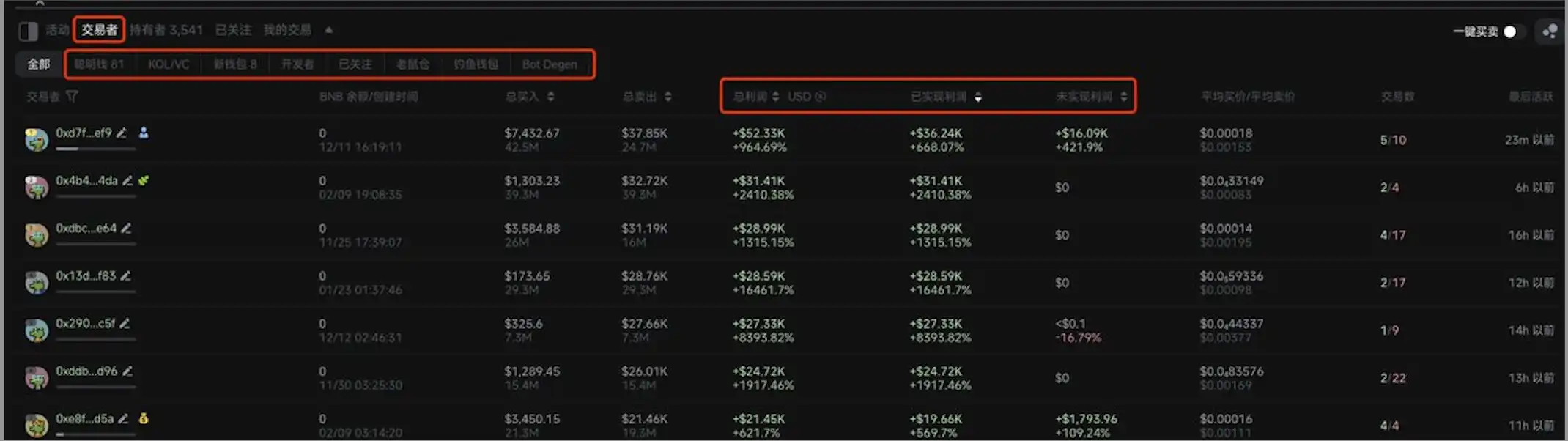 【交易者】是 Top100 最赚钱地址的列表,其中又按「聪明钱」、「KOL/VC」、「新钱包」、「开发者」、「老鼠仓」、「钓鱼钱包」、「Bot Degen」进行分类。我们可以按「总利润」、「已实现利润」、「未实现利润」等指标进行排序,筛选符合自己标准的聪明钱。