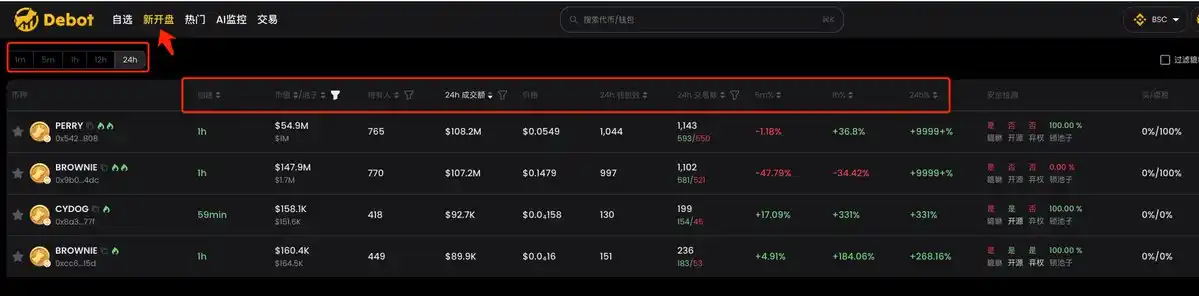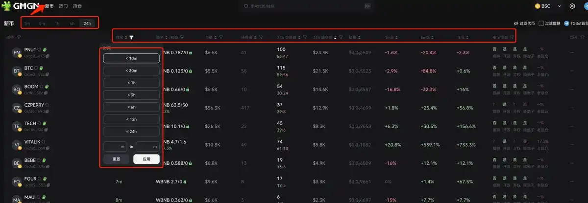 gmgn 前段时间刚支援 BSC 链,还被 cz 转发引用。gmgn 的 BSC 链主要是【新币】和【热门】两个版块,和 debot 类似。【新币】版块也是 24 小时内出来的新币,可以按时间筛选,粒度更细些;安全检测也支援筛选,EVM 上有些币刚开盘时不开源、不弃权、不锁池子都很常见,所以支援筛选确实很实用;其他的指标都是常见的,如图