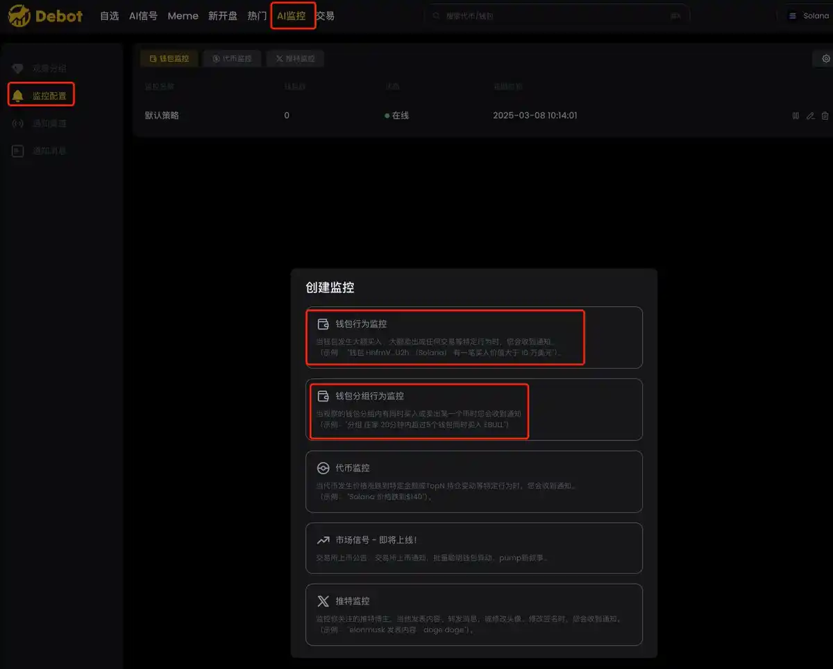 debot 的钱包分组行为监控正好实现了我上面的策略,而且做的更精细,指标粒度更细,如图。我们可以根据买入和卖出做监控、可以设定监控时间段、交易金额、通知频率、市值大小。完全可以满足各种监控需求,强烈推荐此功能。
