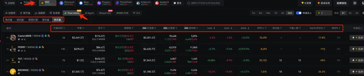 ave 上单独把 Four.meme 的币做了一个版块,支援【热内盘】、【新内盘】、【即将打满】、【新外盘】、【热外盘】五个版块。用来扫链还是不错的,感觉比官网的扫链舒服很多,希望其他家工具早些跟进。