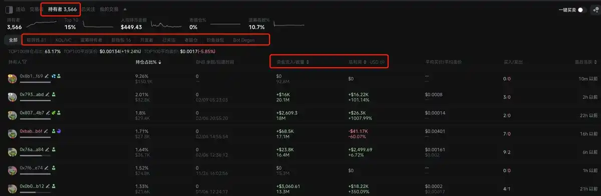 【持有者】是 Top100 持仓的地址列表,其中按「聪明钱」、「KOL/VC」、「蓝筹持有者」、「新钱包」、「开发者」、「老鼠仓」、「钓鱼钱包」、「Bot Degen」进行分类。我们可以按「资金注入 / 数量」、「总利润」进行排序,筛选符合条件的聪明钱。