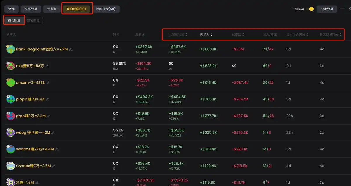 debot 监控汇入聪明钱后,我们可以在币的 K 线页面【我的观察】版块看到【持仓明细】和【交易明细】。【持仓明细】列出了交易过这个币的所有聪明钱的资料,可以按各种指标进行排序筛选,方便我们检视有哪些聪明钱已经上车。