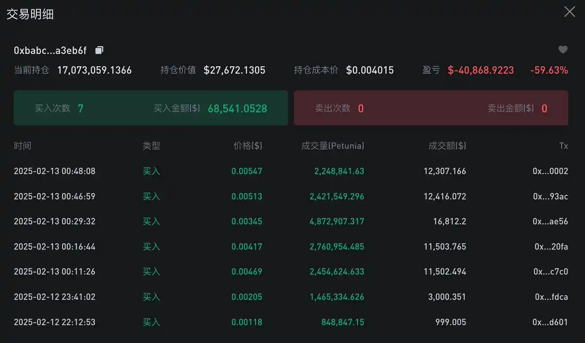 随便点一个地址,在介面的右侧会出现此地址的详细盈利资料和交易记录。