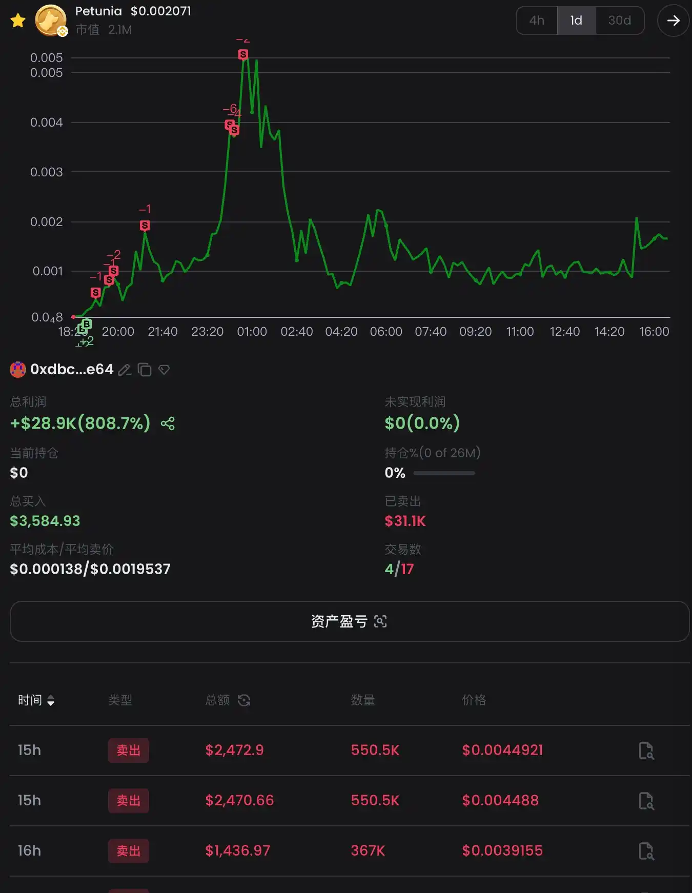 我们如果想看一个地址的总体盈利资料、最近盈亏、持有代币、最近交易记录,也可以把此地址输入到搜寻框中,即可以看到详细资料。