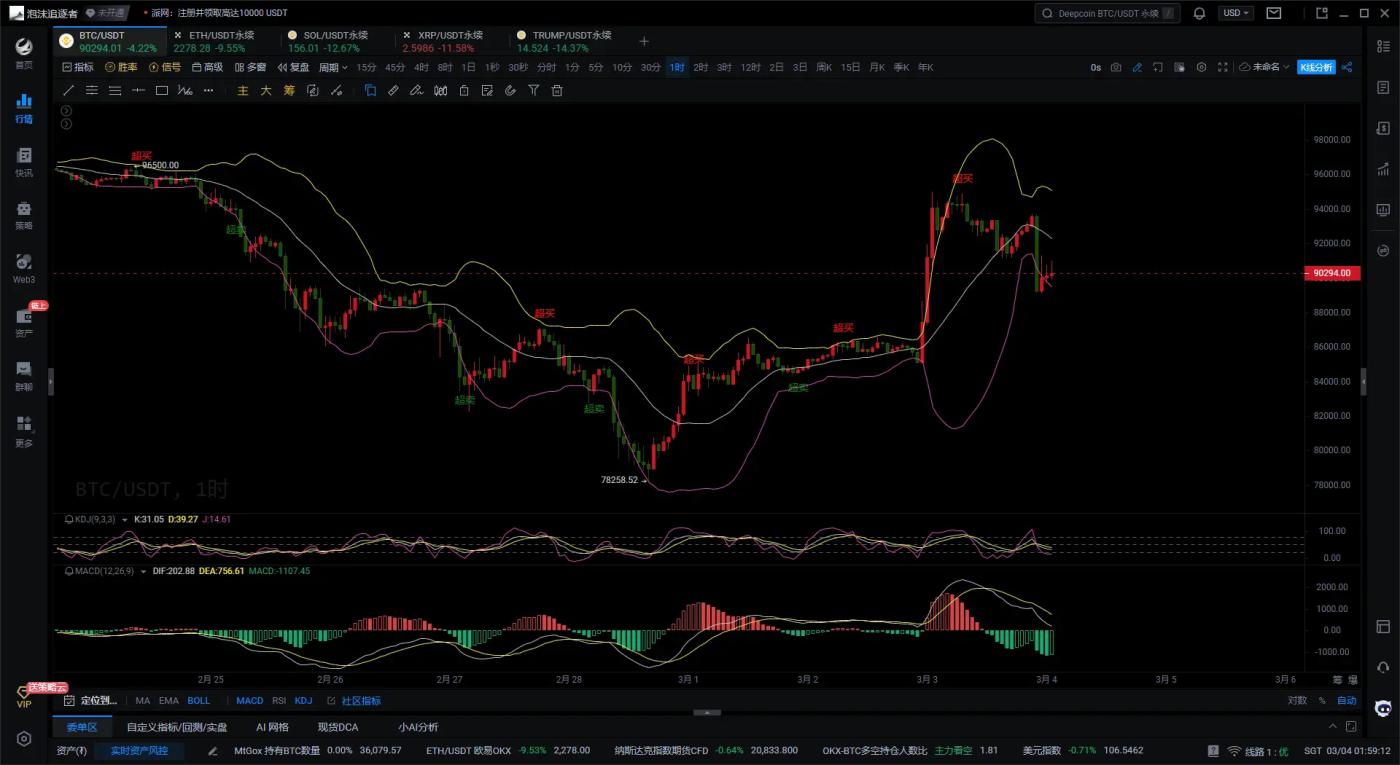 首先,根据比特币1H级别图中的布林带指标来看,当前比特币的价格正经历强势反弹,从低点78258低位启动,并已突破了之前上轨,市场波幅持续加大。经过短时间冲击至96000的高位无果后,价格正在小幅回落,现在接近90000处盘整调整。短线内有调整的必要,一旦价格跌破布林带下轨89000支撑位,市场可能会进一步下跌至87000附近。然而,如果下轨得到稳固支持,那么可能再度挑战92000至94000区间。
