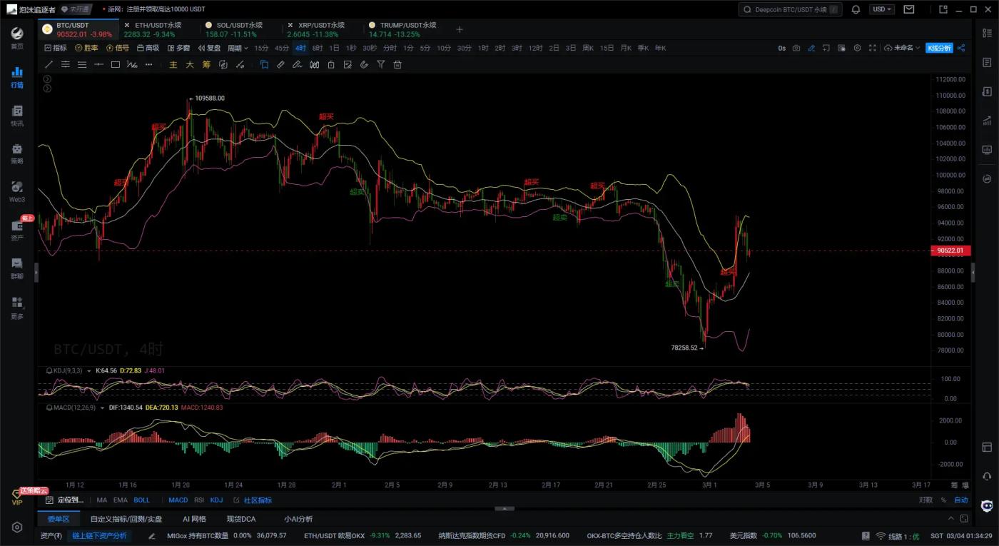 首先,根据比特币4H级别图中的布林带指标来看,价格从78258.52的低位开始,表现出了强烈的反弹态势,并成功突破了布林带中轨的阻力。目前价格已经逼近布林带上轨的压制位,由于接近该区域的压力,短期内可能出现价格回调的风险。随着布林带的开口向上,市场波动性加大,这说明当前市场处于上行趋势。但同时,短期内的价格调整也难以避免。目前,比特币已经进入了一个关键的90000至92000的压力区域,如果进一步突破上轨可能挑战95000,但如果回调则需警惕88000附近的支撑。