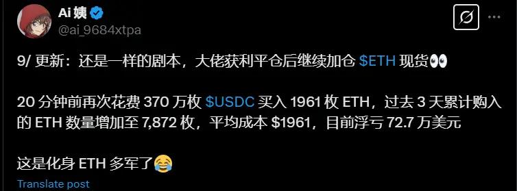 20 分钟前再次花费 370 万枚 USDC 买入 1961 枚 ETH,过去 3 天累计购入的 ETH 数量增加至 7,872枚,平均成本 1961 美元,目前浮亏 72.7 万美元。