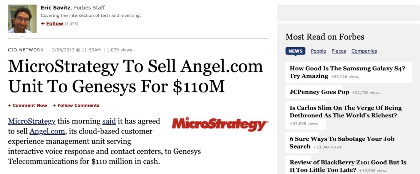 MicroStrategy最终在2009年以2770万美元将Alarm.com及其相关业务出售给风险投资公司ABS资本合伙公司。2013年,软件公司Genesys以1.1亿美元现金收购了Angel.com及其业务,并迅速将其纳入自己的公司。
