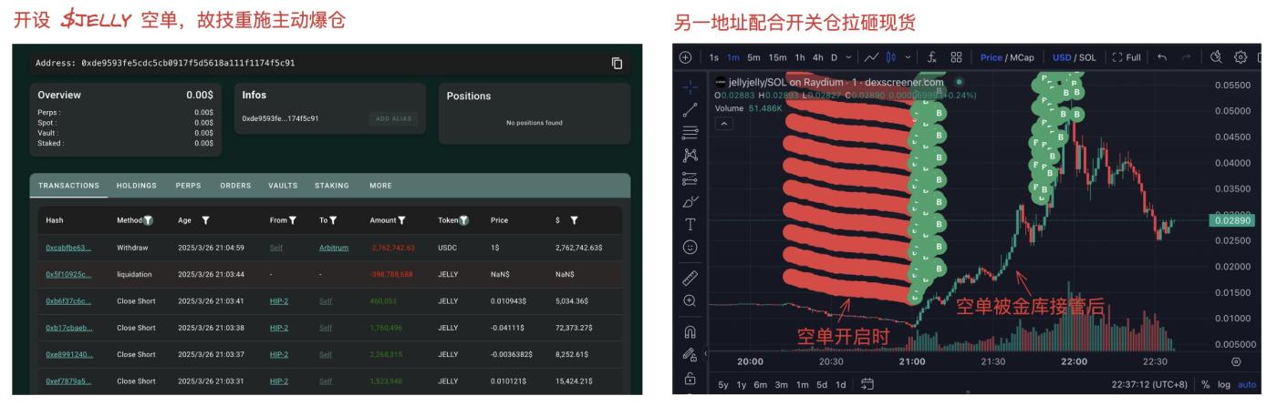 一操纵 JELLY 币价地址(操纵币价地址链接:https://intel.arkm.com/explorer/address/Hc8gNSMaQiahiRiGjUfTaW8AXudRJHeGoeGpAn8WRcwq)在空单开启后配合砸盘现货压低币价,使得空单出现浮盈空间。昨日 21 点 03 分,该交易员以 0.0103 美元的价格平掉了 3000 万枚 JELLY 空单(价值约合 31 万),此后提走保证金 276 万美元导致其 3.98 亿枚 JELLY 空单(价值约合 450 万美元)强平被 Hyperliquid 的清算地址以 0.0113 美元的价格接手。