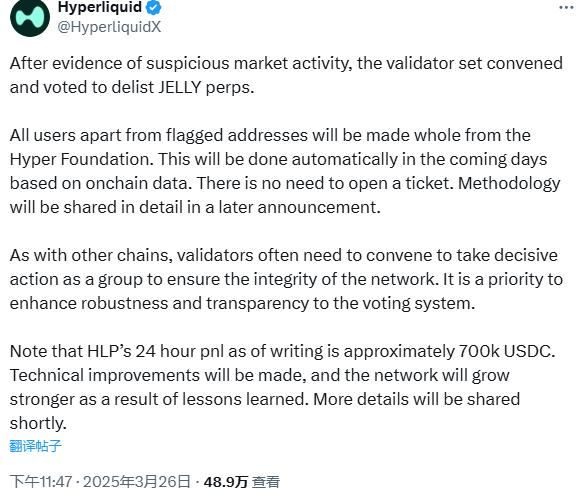 因市场活动异常,验证者投票决定下架 JELLY 永续合约。经过验证者集体讨论,最终决定移除 JELLY 交易对,以维护市场公平性。除了被标记的地址外,所有用户的资金损失将由 Hyper Foundation 进行补偿,补偿将基于链上数据自动执行,用户无需提交工单。具体计算方法将在后续公告中详细说明;
