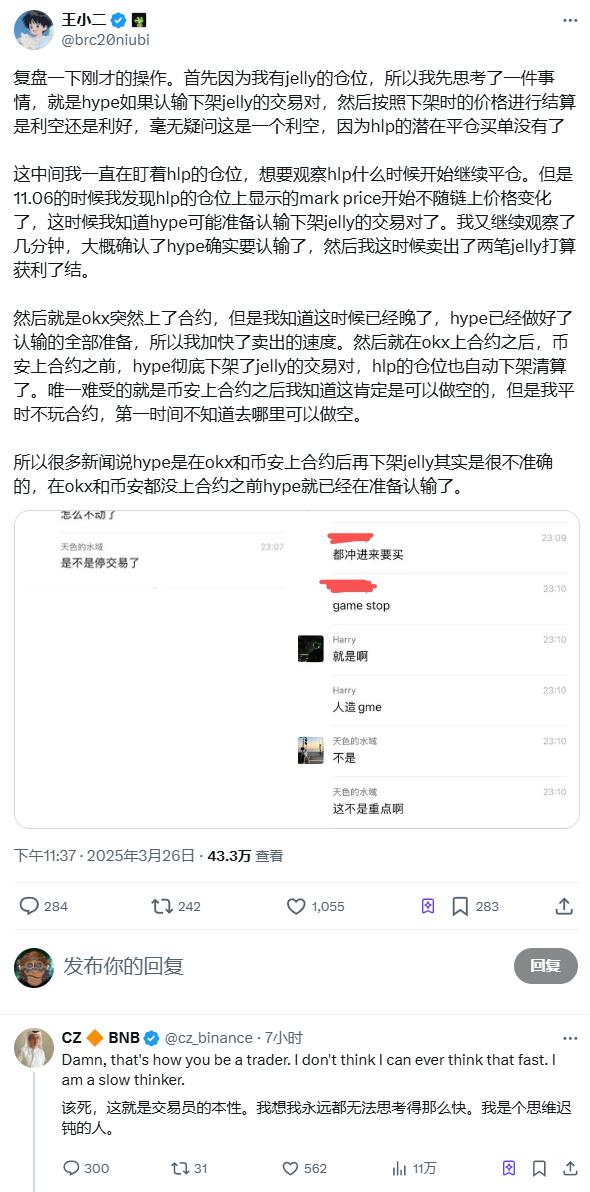 根据 KOL 王小二(@brc20niubi)在 X 平台描述(CZ 也评论了该内容),在 OKX、币安相继宣布上线 JELLY 合约交易之前的几分钟,Hyperliquid 已经做好了认输的准备并彻底下架了 JELLY 交易。下图为王小二对本次 Hyperliquid 的操作回顾与 CZ 评论。