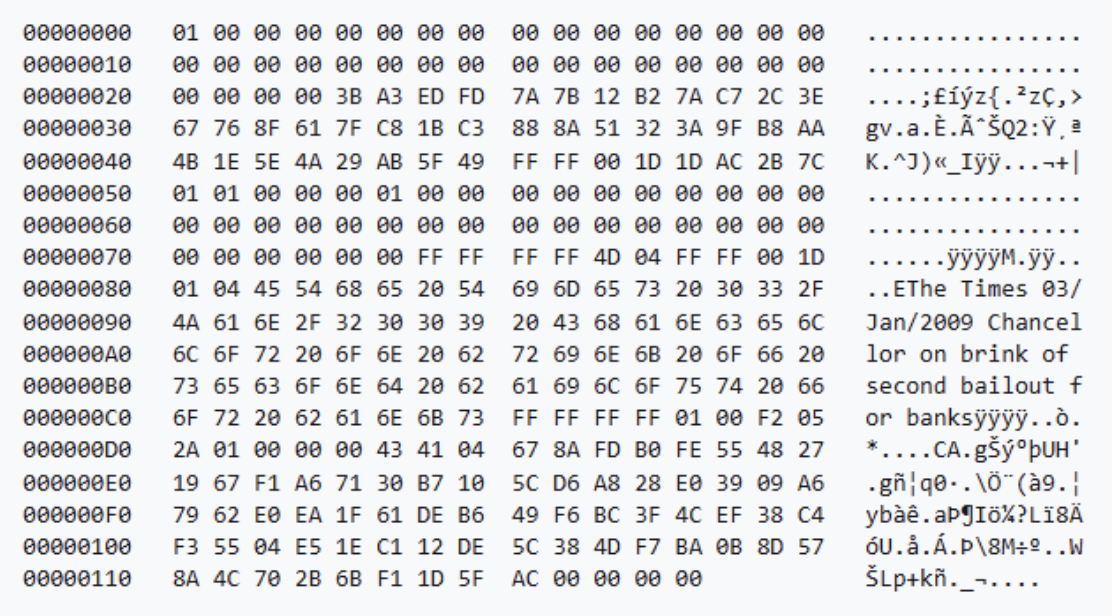 比特币的第一个区块(Genesis Block)中,藏有一句英国《泰晤士报》标题:「The Times 03/Jan/2009 Chancellor on brink of second bailout for banks」(财政大臣将再次拯救银行业),被视为中本聪对金融危机与政府干预的不满。