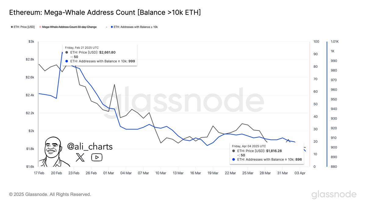 链上数据表明,自 2 月份以来,以太坊持仓巨鲸(持仓量> 10000 枚 ETH)数量约下降了 10% ,数量从 999 降至 896 个地址。