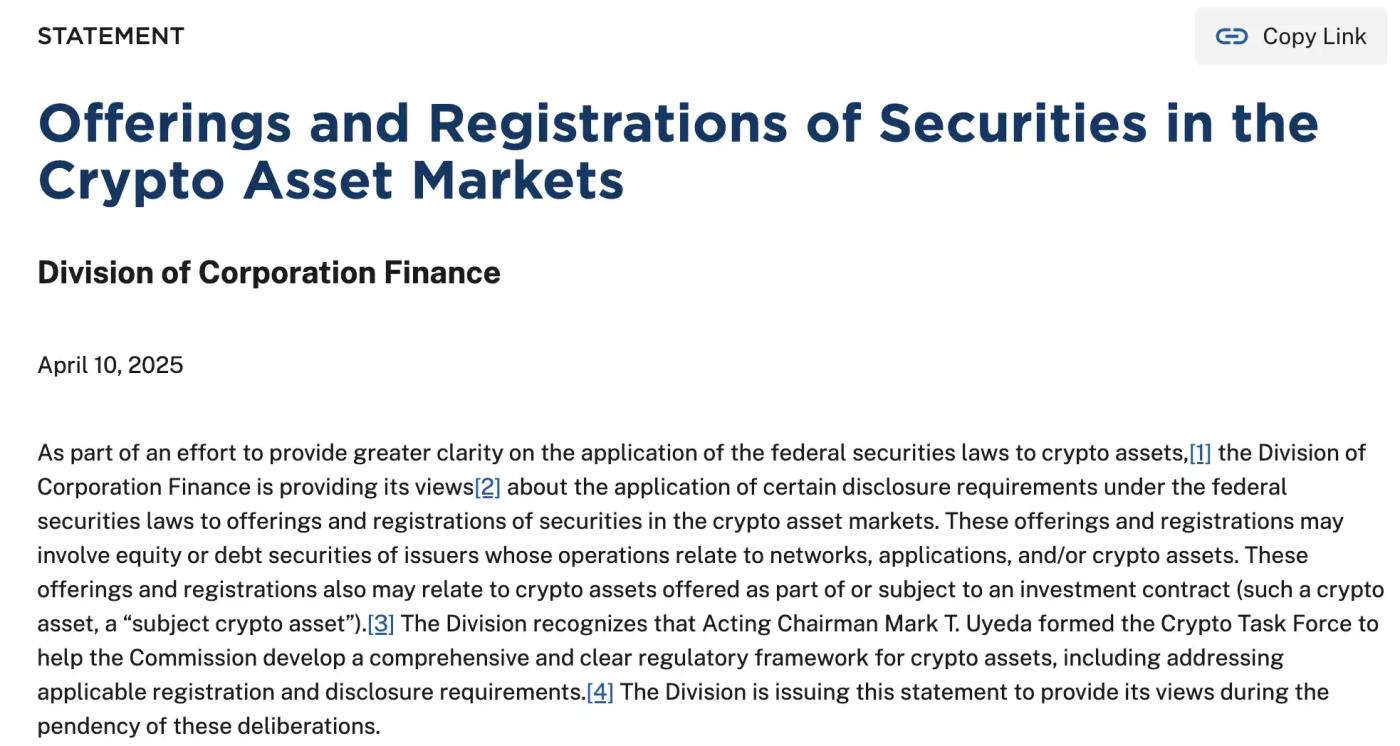 此外,为推动监管清晰化,SEC 加密货币工作组计划在 2025 年 4 月至 6 月举行四场公开圆桌会议,主题涵盖加密交易、托管、资产代币化和 DeFi。专员 Hester Peirce 称此为「通往加密清晰的春季冲刺」,标志着 SEC 从对抗转向合作。首场会议将于 4 月 11 日聚焦「为加密交易量身定制监管」,后续会议将探讨传统金融与区块链的融合及 DeFi 与美国精神。