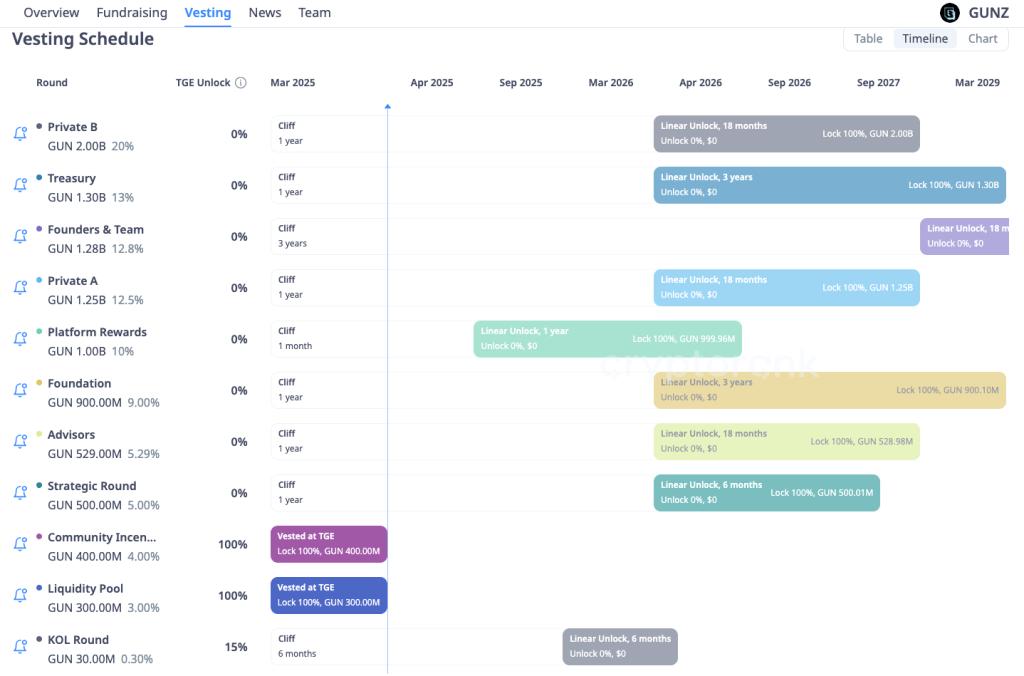 强大代币模型:$GUN 总供应量为 100 亿枚,投资人持仓严格锁定,收入驱动的回购机制增强市场健康。初期仅有 5 – 6% 可流通,强化长期价值对齐。